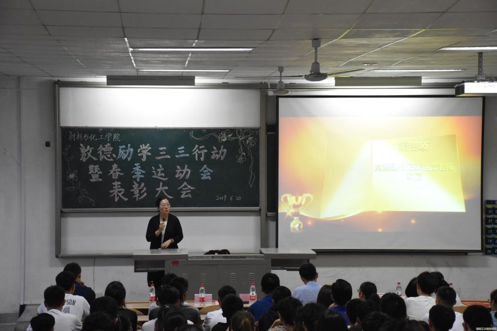 “三三行动”优秀学生代表张思雨在发言中表示,作为学生干部深知自己在“三三行动计划”中的责任,深深感受到“三三行动”实施过程中,身边同学在学习、实践、创新等方面的提升和转变,向大家展现出一名优秀青年大学生应有的状态。她指出通过此次活动,无论是在知识积累还是个人素质都得到了提升。随后,学院党委副书记张艳霞作重要讲话,表示代表学院就2019年在学风建设、学生科技竞赛、创新创业、文体活动中取得的成绩给予充分肯定和衷心感谢,并指出,学院实施“敦德励学三三行动计划”正是响应新时代全国高等学校本科教育工作会议精神,推进本科教育“四个回归”中的第一个回归,引导同学们求真学问,激发大家的学习动力和专业志趣,改变轻轻松松就能毕业的情况,真正把内涵建设、质量提升体现在每一个学生的学习成果上。张艳霞老师对学生提出三点要求:一要重新出发,秉持谦虚的态度,在向优秀者学习中进步;二要不断学习,向在座的各位学习,向自己学习,不断提升自己的学识;三要不断改变,适应新环境、新身份,把材化精神传递到材化全体学子身边。