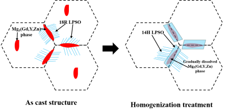 长周期堆叠有序(LPSO)结构的提出对镁合金的性能有着明显的影响,这种结构可以显著提高镁合金的强度和塑性。针对这个问题,论文提出了LPSO结构的演变机制,并且从异质形核和条幅分解的角度阐明了在均匀化处理过程中14H-LPSO与18R-LPSO结构之间的转变过程。这一成果不仅明确的标定了铸态和均匀态下不同类型的LPSO结构的存在状态,而且对稀土镁合金的时效析出相提供新的表征角度和思路。
