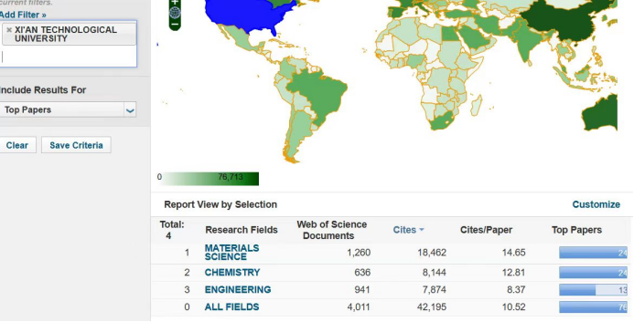 截止目前,我校共发表ESI论文4011篇。其中,高影响力论文76篇,高被引论文75篇,热点论文4篇,总被引频次达到42195次。在高被引论文发表数量中,材料科学24篇,化学学科23篇,工程学学科13篇。