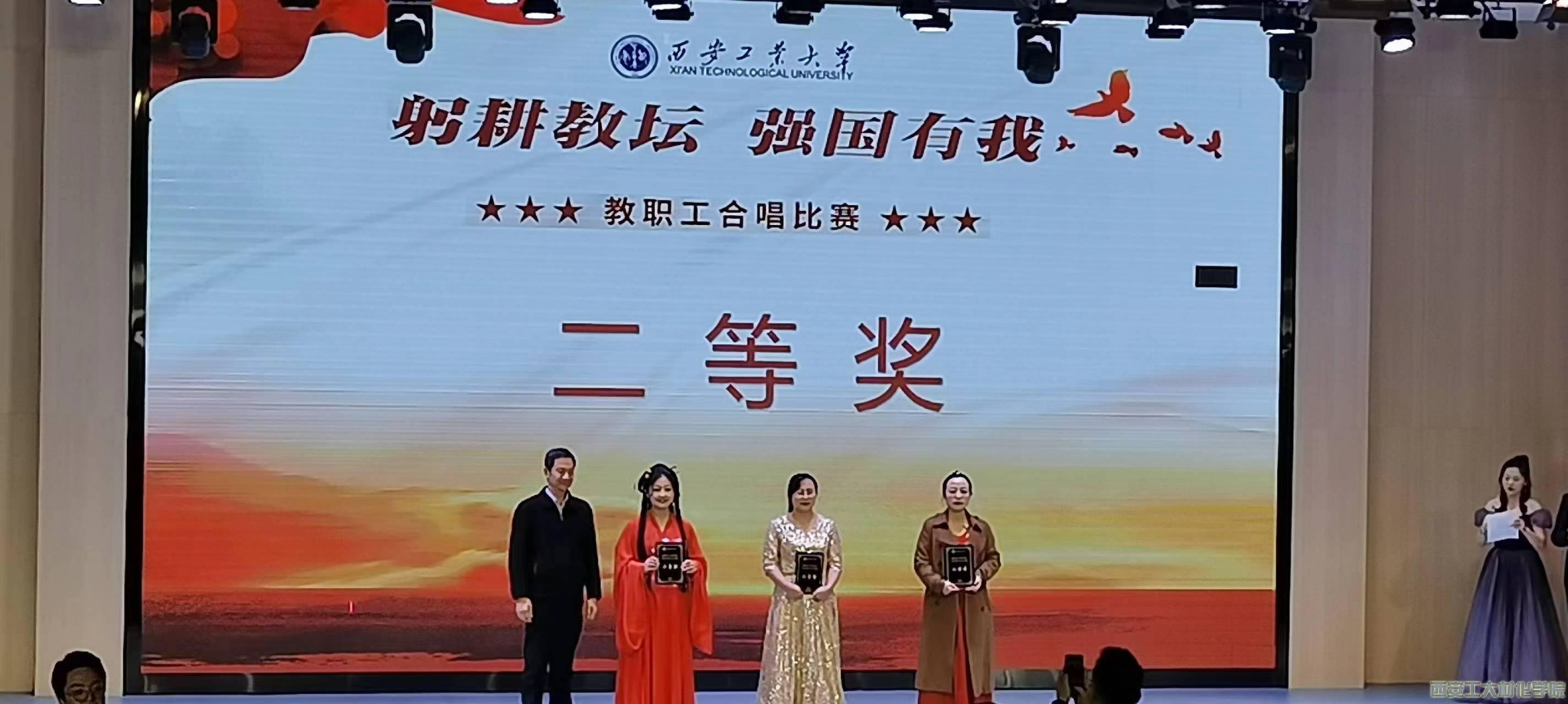 比赛场上,随着悠扬的旋律响起,我院教职工盛装亮相,指挥从容有力,歌声慷慨激昂,高潮迭起的乐曲,激情澎湃的歌声,鼓舞人心,振奋精神,点燃了台下观众的爱国热情。bat365官网登录入口教师合唱团在现场喊起了“强国有我,请祖国放心”的口号,展现了学院教职工努力创造属于bat365官网登录入口新时代光辉成绩的信心和决心!颁奖仪式上学院工会主席金耀华代表合唱团领取二等奖奖牌。