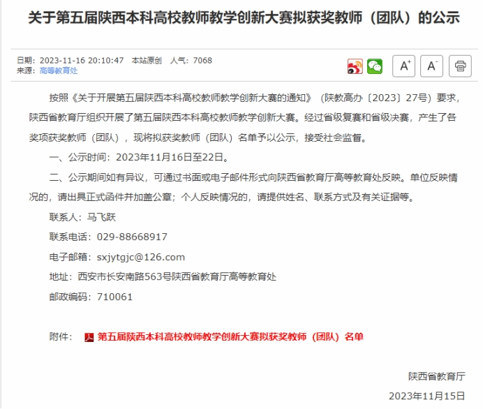 2023年11月16日,陕西省教育厅公布了第五届陕西本科高校教师教学创新大赛获奖教师名单,我院教师罗春燕(团队)获省级一等奖,梁艳峰(团队)获省级三等奖。