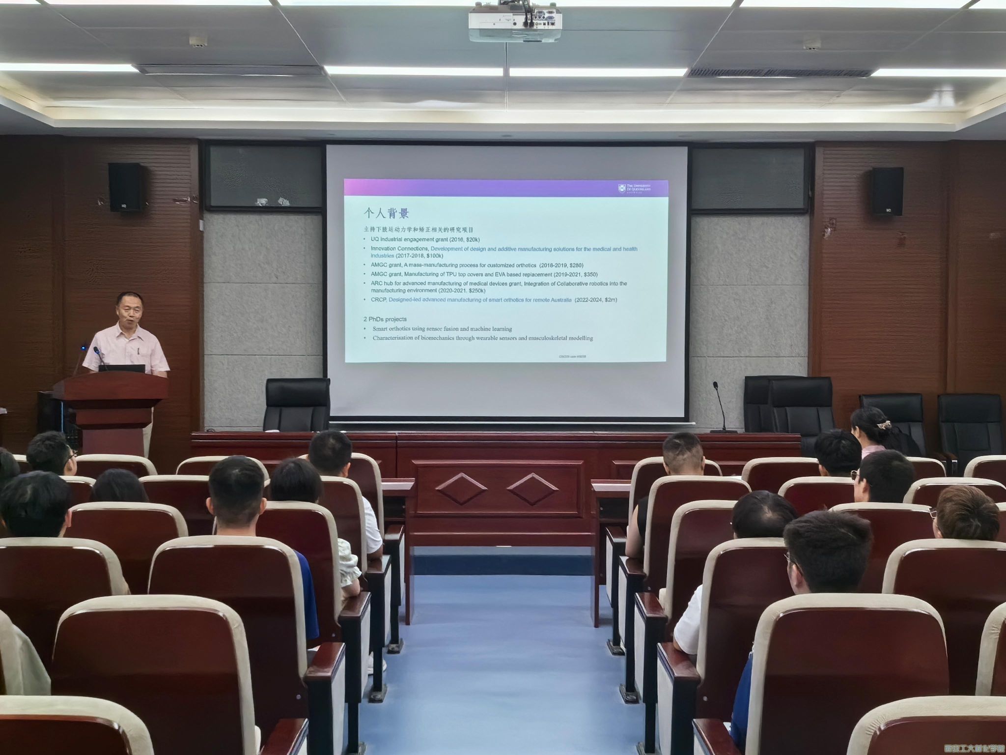 会后,王贵又做了《下肢生物力学的研究和应用》的“知行讲坛”学术报告。介绍了昆士兰大学足踝生物力学研究小组在医学工程领域的最新研究成果。利用力学方法研究生物系统的结构、功能和运动,通过引入嵌入式系统,实时监控患者的步态信息。给教师和学生带来了包含物理、工程以及生物和医学多学科相互交叉融合的知识。听了王贵研究员的报告,大家都觉得受益匪浅。