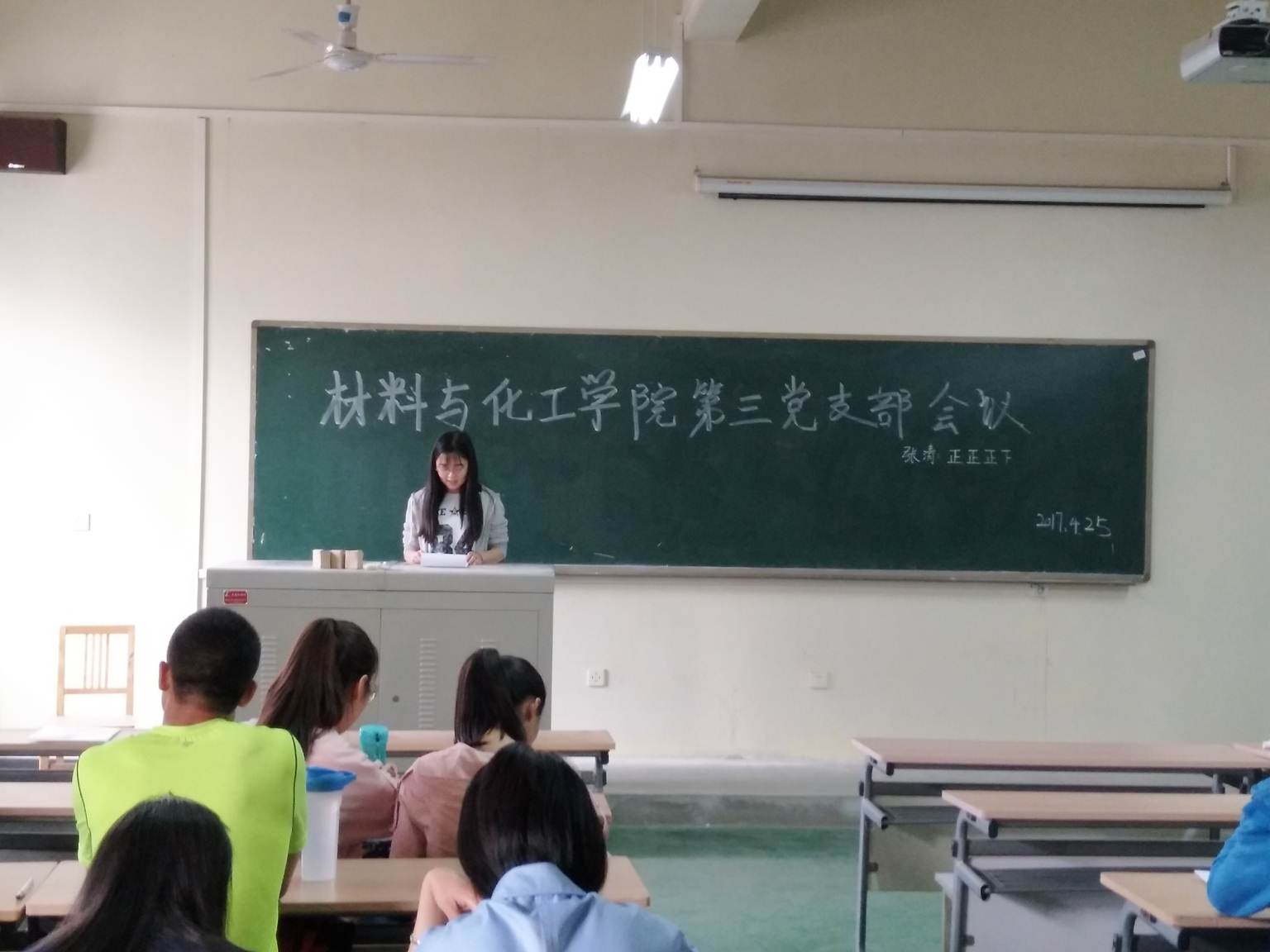 2017年4月25日下午17:20,bat365官网登录入口第三学生党支部在工3-504召开了支部第三次会议,参加本次会议的有支部书记段强老师及党支部全体成员。会议主要讨论张清、唐凤同志能否如期转问题。