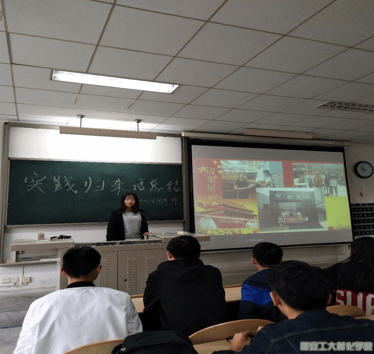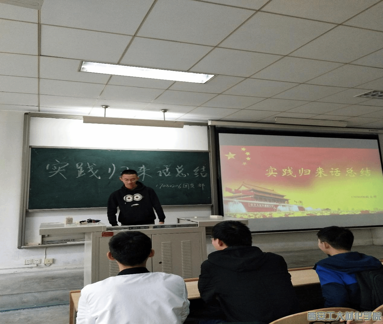 本次活动由17030206团支部的班长担任主持人。活动开始,班长提出有关假期实践的几个问题,同学们都积极踊跃的回答。接着,班长让同学们回想自己实践时的所见、所闻、所感并和身边同学分享自己的实践经验,大家都积极分享自己的实践小故事,发表着自己对实践活动的看法和感想。随后,两位学生代表在讲台上分享他们在实践时的经历及感想,并让大家观看当时实践的照片。同学们都很认真的倾听、讨论、分享。最后,由主席付贵分享他的实践经验和实践故事并对本次团日活动进行总结。至此,本次团日活动圆满结束。