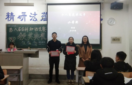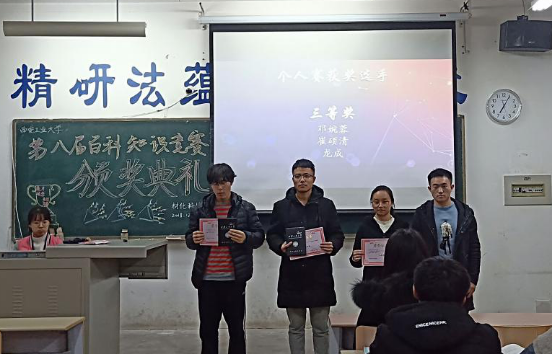 本次百科知识竞赛分别进行了初赛和决赛,分为个人赛及团体赛同时展开比赛。每场比赛分为三个环节,赛场上每个人都镇定自若,自信果断,每个团体都团结一致,展现出他们最好的姿态。经过了三轮激烈的比拼后,个人赛的梅林熙等六人获得优秀奖;邓婉蓉等三人获三等奖;韩雷、李梦婷荣获二等奖以及杨丹娜荣获一等奖。团体赛的十一班、一班和六班获得优秀奖;十班获得三等奖;四班获得二等奖以及二班获得一等奖,并由策划部副部长李喆、策划部部长乔国权、副主席白露茜与主席南亚新依次为获奖代表颁奖。最后,南亚新对参赛选手的表现给予肯定,鼓励广大同学踊跃参与课外活动,不断学习,拓宽自己知识面,提高大学生的综合素质。至此,本次颁奖圆满结束。
