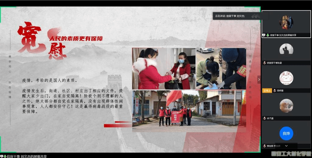 为进一步加深团学干事对全球新冠肺炎严峻形势的了解,学习我国针对疫情开展的有效举措,bat365官网登录入口科学技术协会于2020年4月25日下午六时在腾讯会议召开“致敬战士,全民奋斗”主题学习会议,科协主席王梦豪携科协全体成员参与本次学习会议。本次学习会议由信息宣传部干事刘文杰主持。