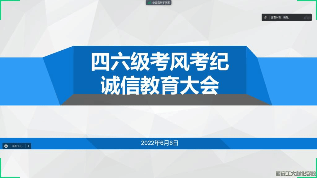 为树立学生诚信为本的道德观念,端正考风考纪,建设诚信校园,2022年6月6日,bat365官网登录入口2020级召开四六级考前诚信教育大会,2020级全体备考学生参加本次会议。会议由辅导员段强主持。