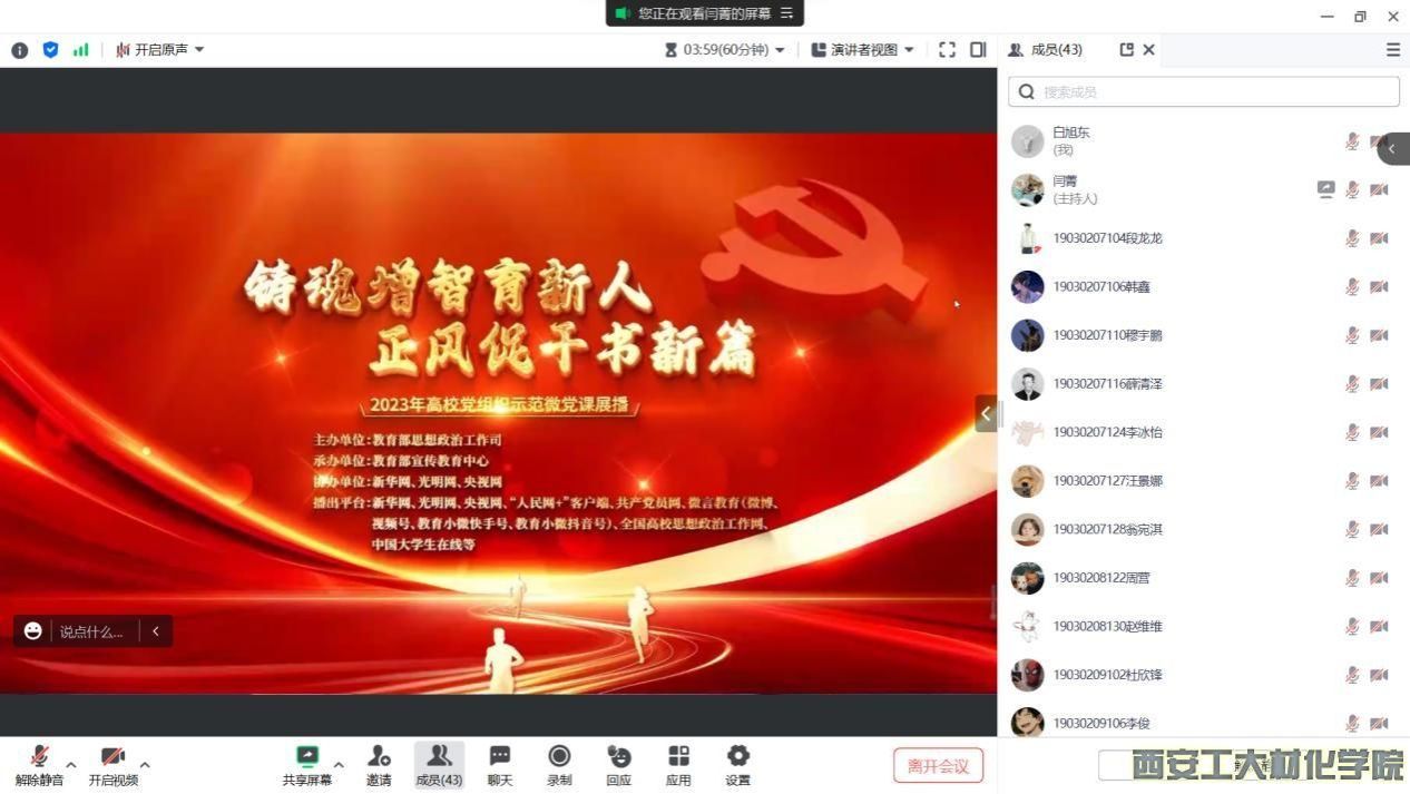 此次大会由支部副书记闫菁主持。会议指出,为全面展现教育系统主题教育突出成果,展现高校师生在新时代新征程中良好精神风貌,发挥高校先进基层党组织和先锋模范人物的示范带动作用,利用高校示范微党课展播的形式来全面展现主题教育开展成效,立体呈现改革发展成绩。广大党员要以学铸魂,以学增智,以学正风,以学促干,书写新时代新征程教育高质量发展新篇章。在新时代新征程上,应以新时代中国特色社会主义思想为指导,奋力答好“强国建设、教育何为”时代课题,坚持以中国式现代化全面推进中华民族伟大复兴。微党课视频中复旦大学化学系教授赵东元强调了材料发展应该聚焦科学问题,聚焦学术前沿,推进高水平科技自立自强,使得支部党员结合自身专业引起深刻讨论。支部书记段强强调,支部党员应以实际行动提升自己的能力,践行初心使命,不辜负党的期望、人民期待、民族重托。