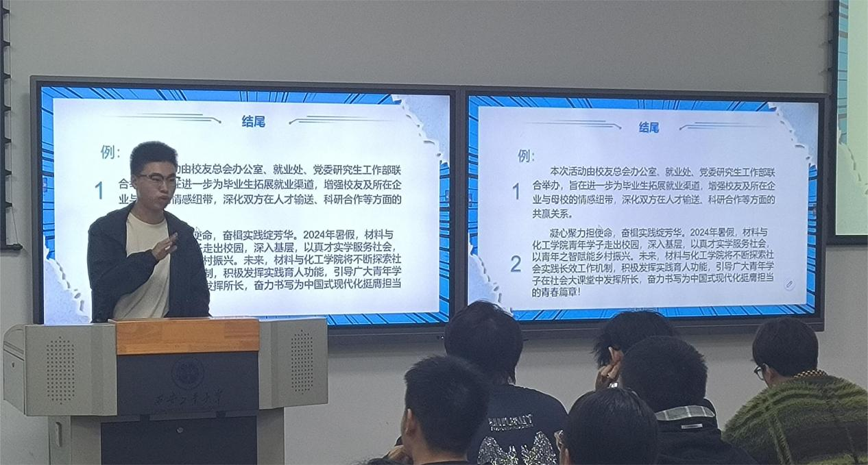 会议伊始,学生干部史佳帆向2024届全体新加入的成员表示热烈欢迎,表达了对新成员们的殷切期望。会上,史佳帆着重强调了组织的工作纪律,讲述了学生工作的根本性质,全体成员深表认同。紧接着,学生干部张天炯指出通讯稿撰写在后续工作中有着重要作用,并围绕通讯稿的内容、格式及其注意事项三个方面进行培训,通过列举多篇优秀范文,从标题、正文、结尾等三个部分充分讲解了通讯稿撰写的要点。最后,张天炯表示想要更好的掌握通讯稿撰写技能需要大家多看、多想、多练、多总结。全体成员受益匪浅。