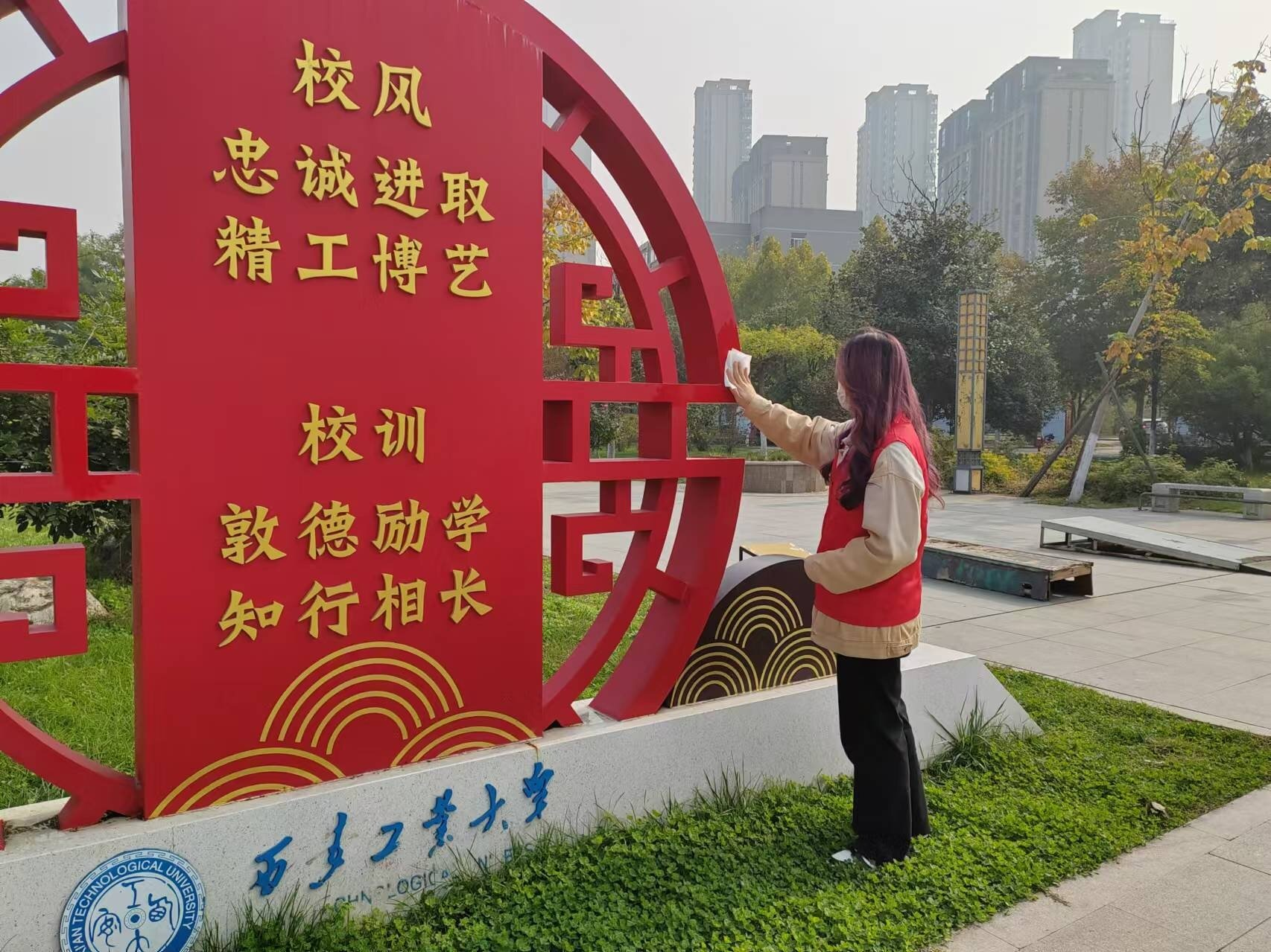 活动开始,支部党员集合在博苑广场进行简短的启动仪式,支部副书记秦正洋强调了此次活动的工作内容和重要意义,鼓励大家以饱满的热情投入到志愿服务中,用实际行动为美丽校园建设添砖加瓦。随后,支部以党小组分工并前往校园内各个区域的宣传牌开展清洁活动。校园内宣传牌作为校园文化的重要载体,承载着学校的历史、文化和精神风貌。针对部分宣传牌表面积累的灰尘和污渍,支部党员用湿抹布细心擦拭,用刷子轻轻刷去污渍,确保宣传牌干燥无水印。在大家共同努力之下,校内8个显著宣传架焕然一新,整体志愿服务过程展现了支部高度的责任心和团队协作精神。