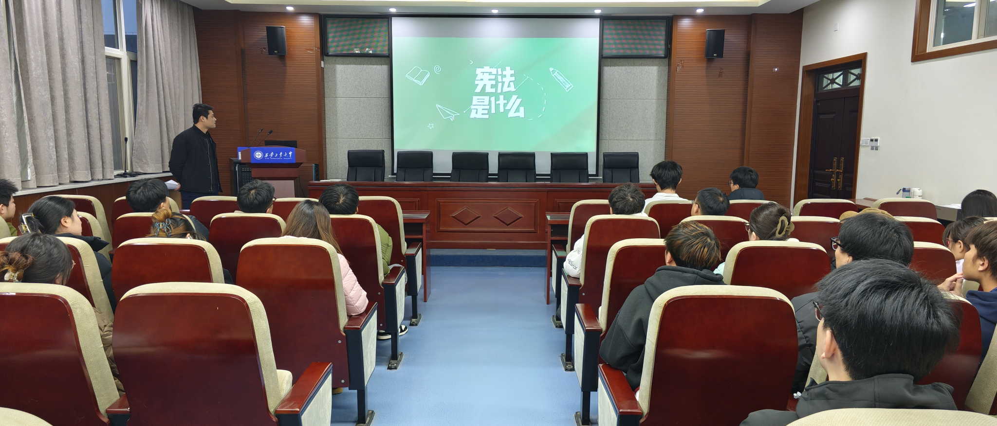 12月4日为国家宪法日。宪法的实施具有保障国家权力有序运行、确认和保障公民基本权利等重要性。会上,段强带领全体参会学生观看《宪法之光,照亮美好生活》宣传片;观看后,并与同学们一起重点学习了《中华人民共和国宪法》的地位与作用、目的和意义。随后,段强结合具体案例讲述了公民依照宪法规定在政治、人身、经济、社会、文化等方面享有的主要权利,并且在推动经济发展、社会进步、政治影响等方面的重要作用,让在场的学生更加深入的了解宪法、遵守宪法和维护宪法。学生刘建君谈到:作为新时代大学生应该将宪法精神内化于心,成为宪法的忠实崇尚者、自觉遵守着和坚定捍卫者;学生张洋谈到:在新时代创造的美好生活中,宪法给我们带来的是爱国情,是自豪感,是无比坚定的自信心。