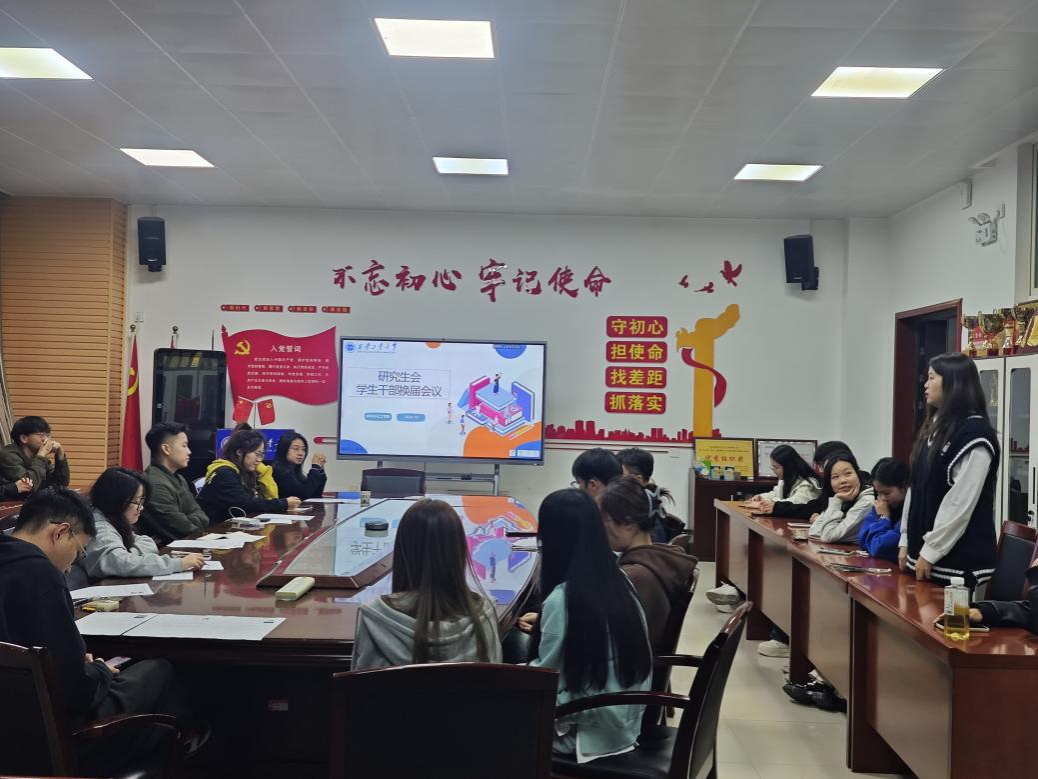 为了充分发挥研究生会的职能和作用,强化研究生干部的凝聚力和组织协调能力,bat365官网登录入口研究生会于10月28日在工三410会议室顺利举办换届暨纳新大会。会议由辅导员张启妍主持,第二届主席团成员及各部门负责人出席。